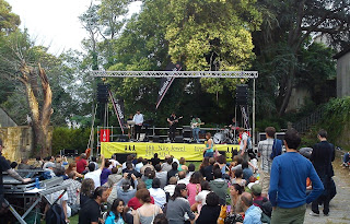 El pasado miércoles tocaba festivalear de nuevo, pero, como ya he explicado en la entrada anterior, este era un festival diferente. Empezando por que tiene lugar en una islita, con aforo limitado, y acabando por que no sabíamos, salvo ligeras sospechas, quienes iban a tocar. Pero la cosa prometía. A pesar de que al llegar al puerto de Redondela, no veíamos la isla, ni el puente de Rande, poco a poco se fue abriendo el día, y mas o menos, el clima nos respetaría toda la jornada. Nada más bajar del barco, nos encontramos con el escenario en el que tendría lugar el primer concierto. Un escenario lleno de cacharrada (cosas de madera, cubos, maletas...). Y con toda esa cacharrada, Hoquets, fueron los encargados de inaugurar el día. Tres belgas, vestidos de colores, con pinta de ser un poco friquis, y un poco mal de la cabeza (en el buen sentido de la palabra), haciendo música con todos esos cachivaches. Muy animados, eso si. Un buen concierto para empezar. Después de estos, y con un buen sitio en la hierba donde sentarse, vimos a L'Enfance Rouge, ese grupo que al parecer, según ponía en las pistas, es admirado por gente como Sonic Youth o Shellac. No estuvieron mal, pero tampoco me emocionaron. En el mismo escenario, solo con una guitarra y acompañado de su mujer, tocaba después Christian Kjellvander, cantautor sueco, muy tranquilote y con pinta de majo, que nos amenizo perfectamente la hora de comer. Tengo que escuchar algún disco suyo, por que seguro que está bien... Los ultimos trozos de bocata fueron durante el concierto de Aries, artista gallega, que armada de guitarra y teclado, ofreció un breve concierto. Tal vez sea por que no sonó muy alto, o por que no estabamos muy atentos, que no puedo valorar el concierto. Lo poco a lo que presté atención, me gustó, todo sea dicho. Pero era momento de cambiar de isla, rumbo a otro de los escenarios, quizá el más chulo, por que se podía ver el mar detrás, cosa que no sucedía en el resto, a pesar de estar en una isla. Allí estaban terminando su concierto Al-Madar, grupo formado por gente de la Orquesta Árabe de New York, y que se veía que eran buenos músicos, aunque no sean mi estilo. Lo malo de este escenario, es que al estar tan descubierto, pegaba bastante el viento... Pero eso no impidió disfrutar del Alela Diane, cantautora de bonita y dulce voz, que con su guitarra hizo que el estar al frío viento fuera un poco más llevadero. Otra para tener en cuenta. Manteniendonos en el mismo escenario, y para finalizar en la isla de San Antón, subía a escenado Maia Vidal, que a pesar del apellido, es americana, aunque afincada en Europa. Acordeón, xilófono, guitarra, pintura en la cara, cinta en el pelo... parecía una pequeña hada o similar, salida de un cuento o asi. Muy bien su concierto. Lo mismo pensaron las niñas que estaban en primera fila (no lo he dicho, pero había un montón de niños pequeños), a las que creo que grabaron para un futuro vídeo de la artista. Una vez finalizado, tocaba volver a la isla principal, y, después de un pequeño paseo curioseando, llegamos al cuarto escenario,al que quedaba por estrenar. Quizá el más grande, y el más chulo, ya que, aunque no tenía el mar detrás, si tenía una bonita arboleda, y podías ver el mar igualmente. Aquí llegaba el turno de Nite Jewel, que, según las pistas, se puede enclavar en la Nueva New Wave. Sonido ochentero, para un concierto bastante entretenido. Unicornibot eran los siguientes, los segundos representantes gallegos de la jornada. Los jinetes del mathrockapocalipsis, como se definen en su bandcamp. Pues eso, mathrock made in Galicia, con cascos de papel albal includidos, que no está mal, aunque para mi, un grupo sin voz, nunca me termina de convencer. Por ello, nos retiramos un poco hacia atrás durante su concierto, que es lo bueno de la isla, que sitio para reposar había bastante, y sin por ello tener que perderse conciertos... Ya solo quedaban dos, y uno de ellos, el de Alt-J, el grupo que ya sabia que iba a estar en el festival, por lo que había escuchado su disco, y tenía muchas ganas de ver. Pueden ser la revelación de este año, o puede que no, pero tienen un gran disco, que en directo lo defienden que da gusto. Y son unos chavales.. quien sabe a donde llegarán, nosotros podremos decir que los vimos en San Simón, una islita en la ria de Vigo... después de su concierto, la cosa llegaba a su fin, por desgracia.... ya solo quedaba una cita más, con Shangan Electro, llegados desde África para poner patas arriba el escenario del Peirao, y despedir esta cita con buen sabor de boca, con bailes y congas, una de ellas liderada por uno de los Hoquets, que estaban alli en el medio bailando como locos, como la gran parte de la gente... Pero llegaba la hora de despedirse, aunque aún quedaba tiempo para que Simon Russell, capo de Rough Trade se pusiera a pinchar, y la gente del último barco pudiese alargar un poco mas la noche.. nosotros ya íbamos rumbo Redondela, con la sensación de haber estado en un festival genial, por el ambiente, la localización, la organización, y, obviamente, la música. Habrá que repetir para el año.